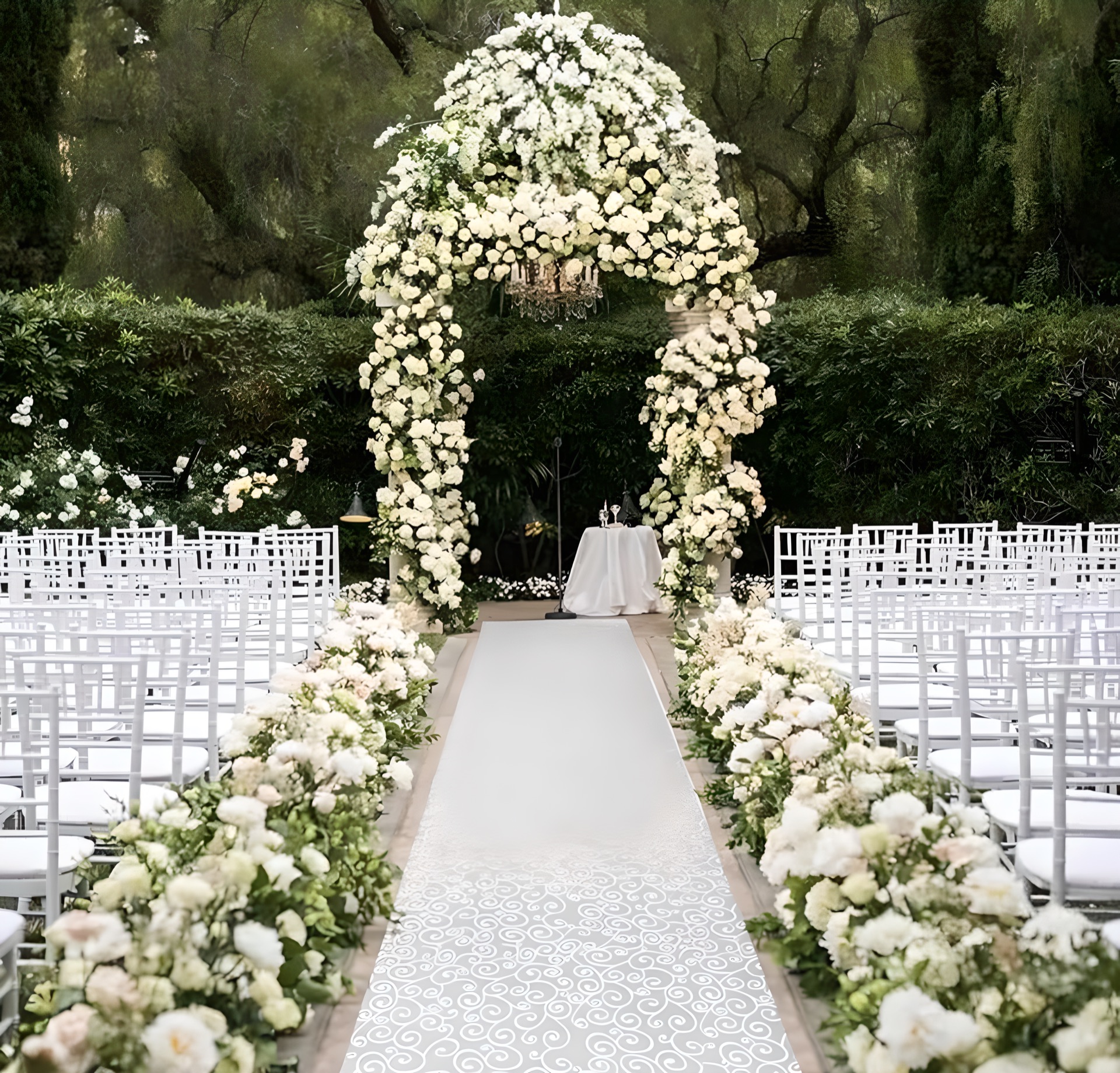 Elegant ceremony and reception styling — floral arches, draped backdrops, table settings, and complete venue transformations.